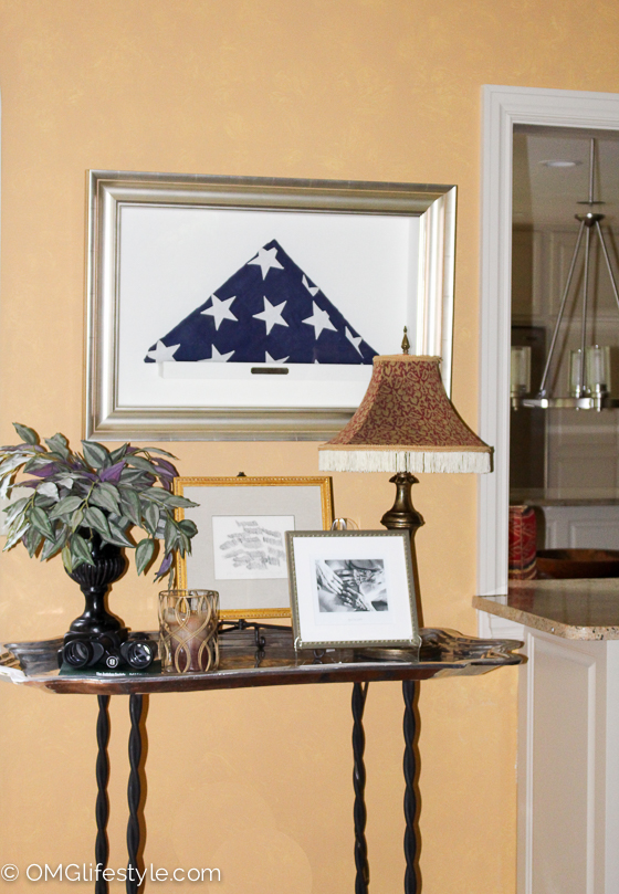 My husband grew up in the military.  His father served in the Air Force.  I wanted to honor my father-in-law by framing the US flag that once draped his coffin.  I thought it would be a wonderful addition to our home.  I like to incorporate personal items that have meaning in my decorating which, in my opinion, makes a house a home.