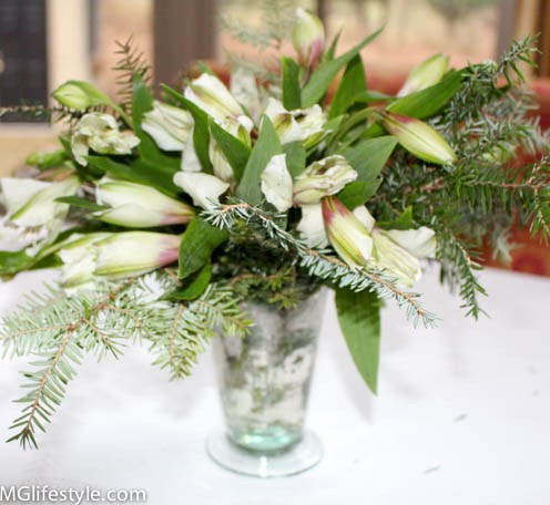 I just bought two small bunches of white astromaria and went into my yard for some evergreen cuttings. Simple, easy and inexpensive.