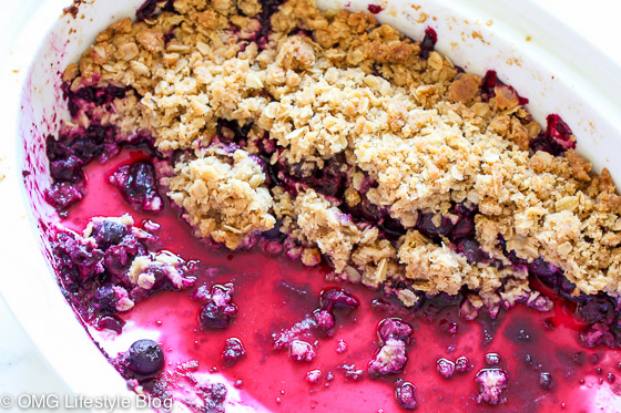 You know it’s done when the topping is golden brown and the blueberries are bubbling up on the sides.