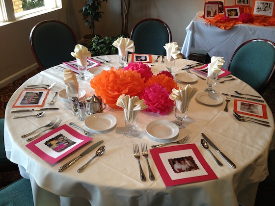 I thought it would be fun to decorate each place setting with a photo of my grandmother with another family member at the party. After selecting my photos, I enlarged and printed them on my home printer on white paper. I used scalloped scissors to cut around the pictures, then glued them on craft paper that I found at Michael’s in the scrapbook section. I chose pink and orange paper to go with my color scheme.