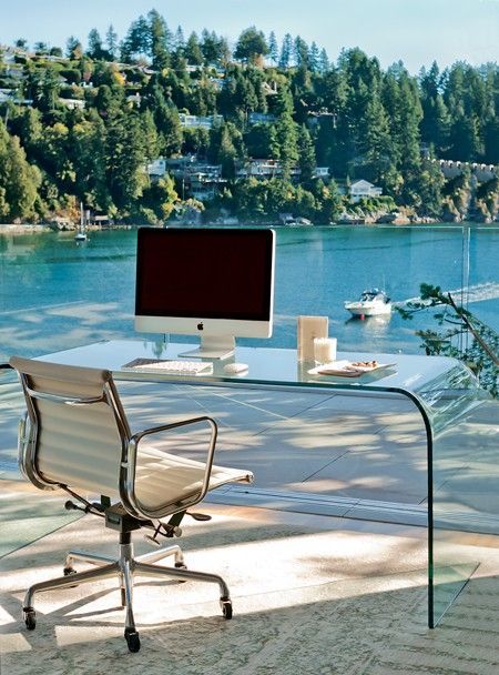 This office had me with the view but I also love the lucite chairs. If there was one material I would like to add to my decorating this year, it would be lucite! It’s fresh, modern and a little edgy. I did a post back in March on lucite coffee tables. Read more at Clearly Glamorous Coffee Tables.