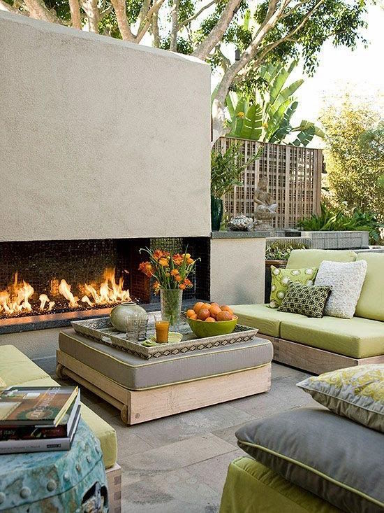 A fireplace is an invitation to sit down and relax. These gorgeous outdoor fireplaces will make you wish for cool evenings to enjoy the ambiance and stars.