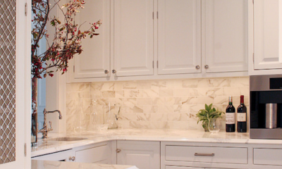 There is so much I love about this kitchen from O’Brien Harris. The commercial grade stainless stove, oven and hood. The oversized island. The gorgeous white marble. I love the large drawers in the island for storage. Another great detail is that the island has legs, making it feel like a piece of furniture instead of built-in cabinets.