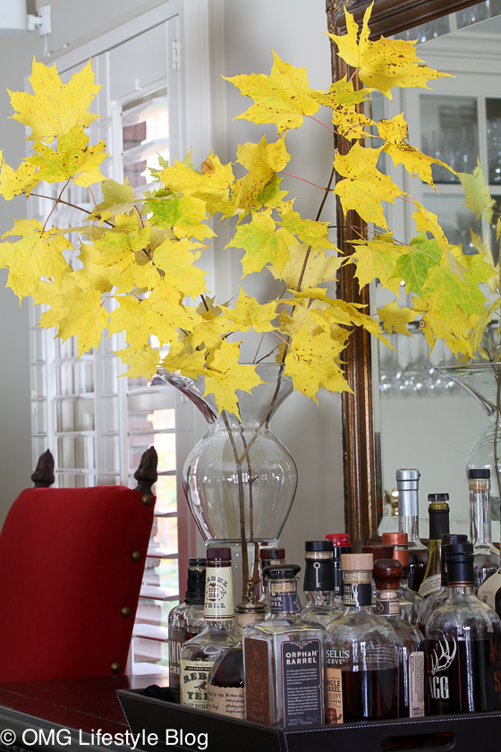 I am excited for my family to visit this weekend.  Our fall foliage in our backyard is spectacular!  It’s at its peak.   The colors are so gorgeous I decided I needed to borrow some of mother nature’s beauty and place some colorful fall branches in a vase in my dining room.  If you are a regular reader of my blog, you will know I have a decorating obsession with tree branches.  See my post Decorating with Branches Adds Life to a Room.