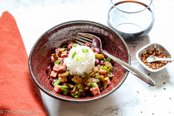 This recipe is easy and quick to put together. To top that off, it also freezes well! I freeze individual portions with rice on the bottom covered with the beans and ham. When serving after making it, I do the opposite. I plate the beans and ham in a bowl and serve with a scoop of rice on top.