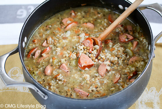 - Add sausage and continue to cook until lentils and rice are done, approximately 20 more minutes.