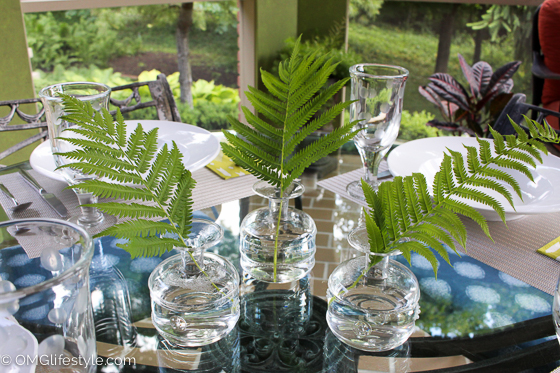Now that it is summer I also like walking around my yard to take clippings for my centerpieces. My ferns are plentiful (they spread like crazy) so I never hesitate to cut as many stems as I need. They are light and airy looking and I love the look of a single fern in each vase.