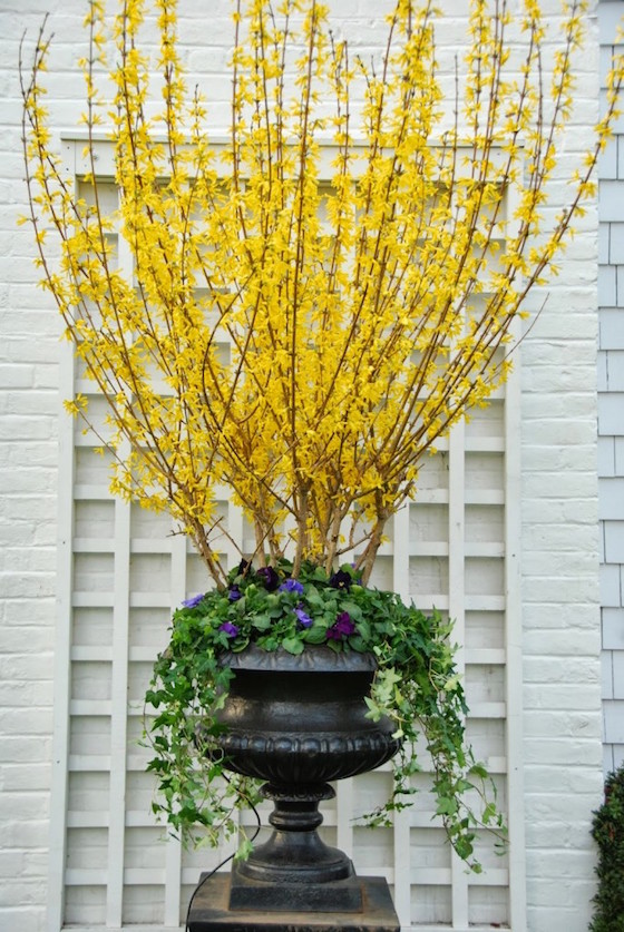 I will always have a fond place in my heart for forsythia. We had some gorgeous forsythia bushes in my yard when I was growing up and if they were in bloom by Easter, we had our Easter pictures taken in front of them. Oh, how I would love to have those shrubs today to create this lovely forsythia urn from Pretty Pink Tulips. It is so striking against the white brick home. I don’t know about you but this is pure eye candy for me!